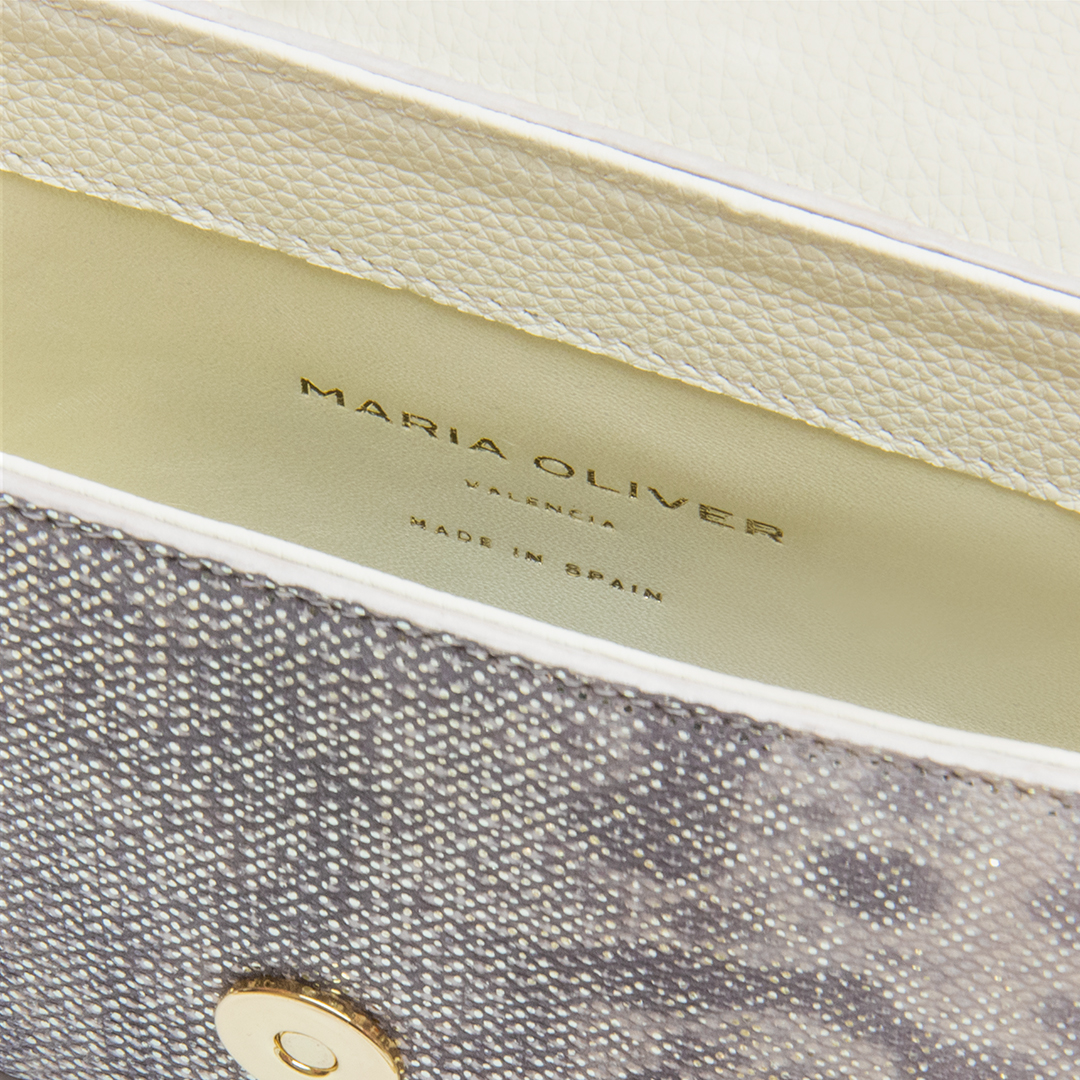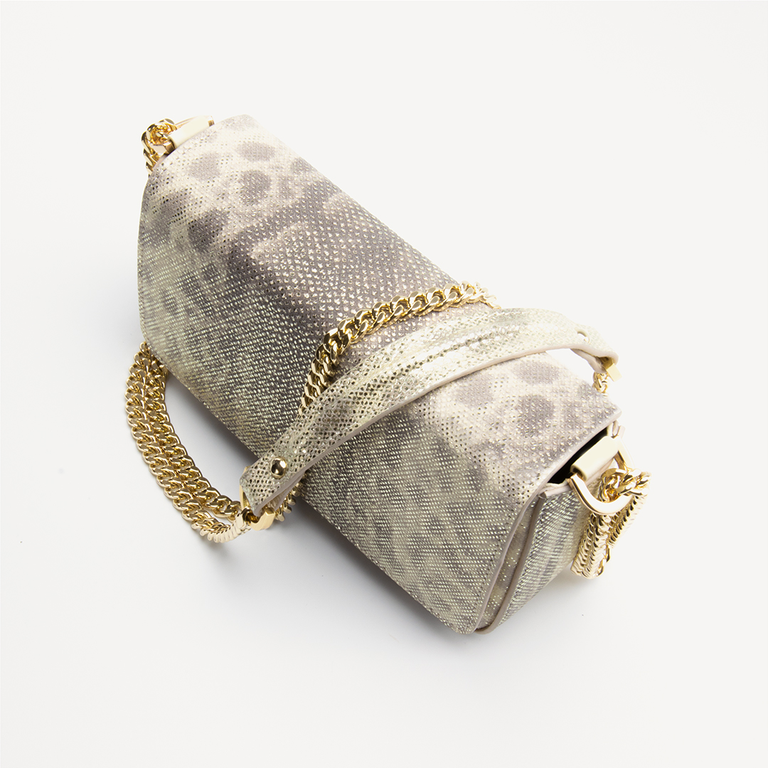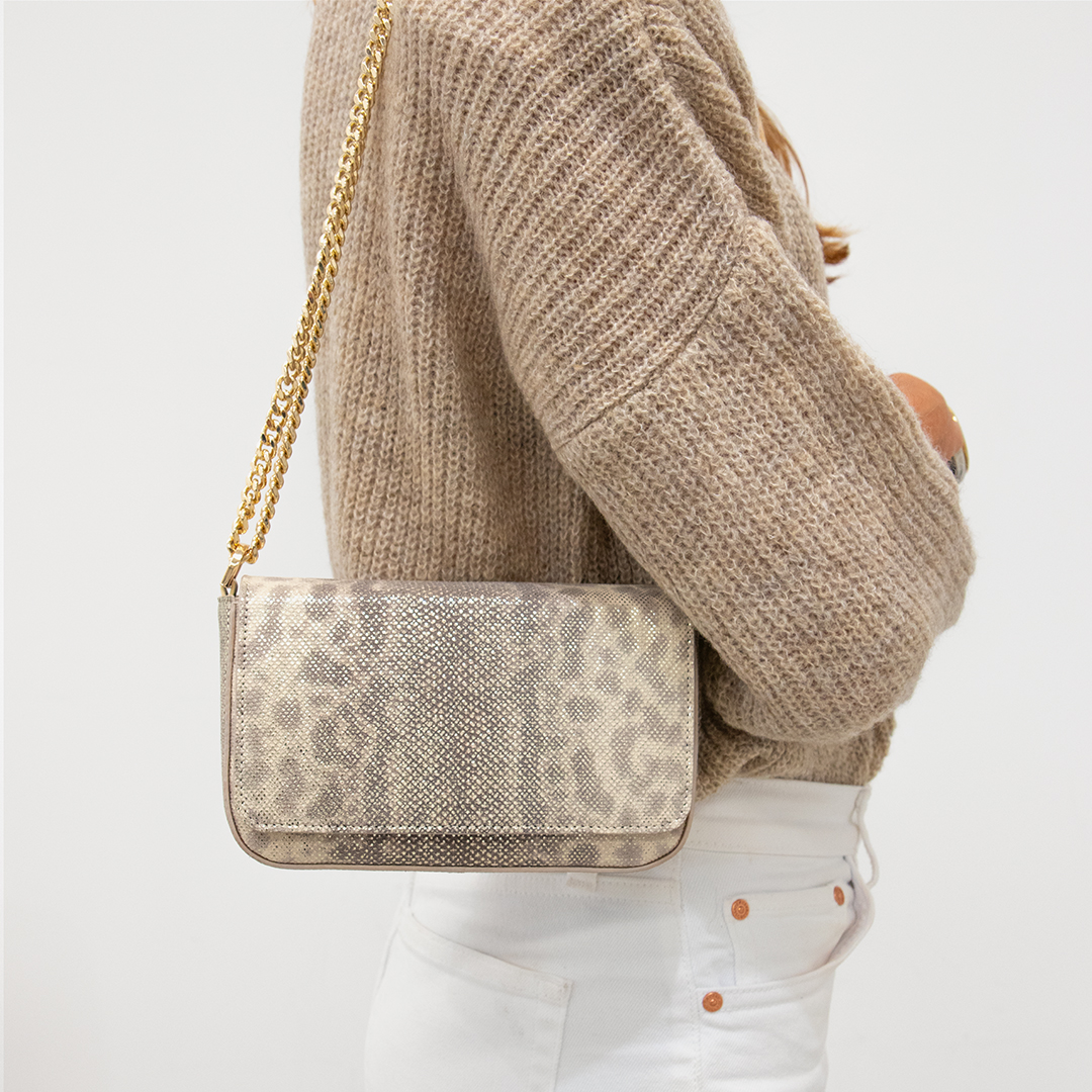 Violeta is the perfect style for day to evening dressing. Karung leather, NATURAL, glittered, with gold finish. Adjustable crossbody model. The Violeta adds versatility to your wardrobe. Wear as a crossbody for a great hands-free option. Adjust the luxurious chain and wear on your shoulder for a night out. This compact style fits all your essentials including a mobile phone. The flap closure keeps all your items safe and secure.