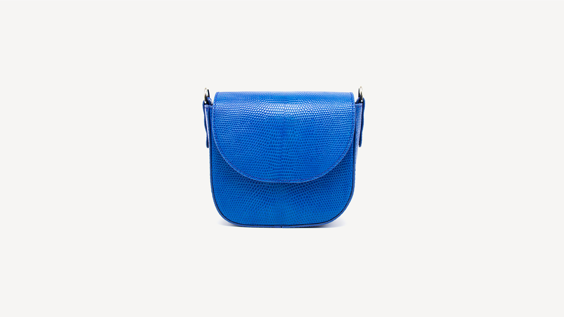 Diana is a new design of a saddle bag: Lizard leather, BLUE, glazed, silver finish. Cross body bag model. Our modern interpretation of a saddle bag. Hold all of your daily essentials in our sweet Diana crossbody. The refined shape and understated elegance makes this silhouette your perfect companion for all occasions. You can carry Diana as a shoulder bag or wear it more casually across the body. The sleek metallic chain with a luxurious leather shoulder guard add to the functionality of this versatile style.