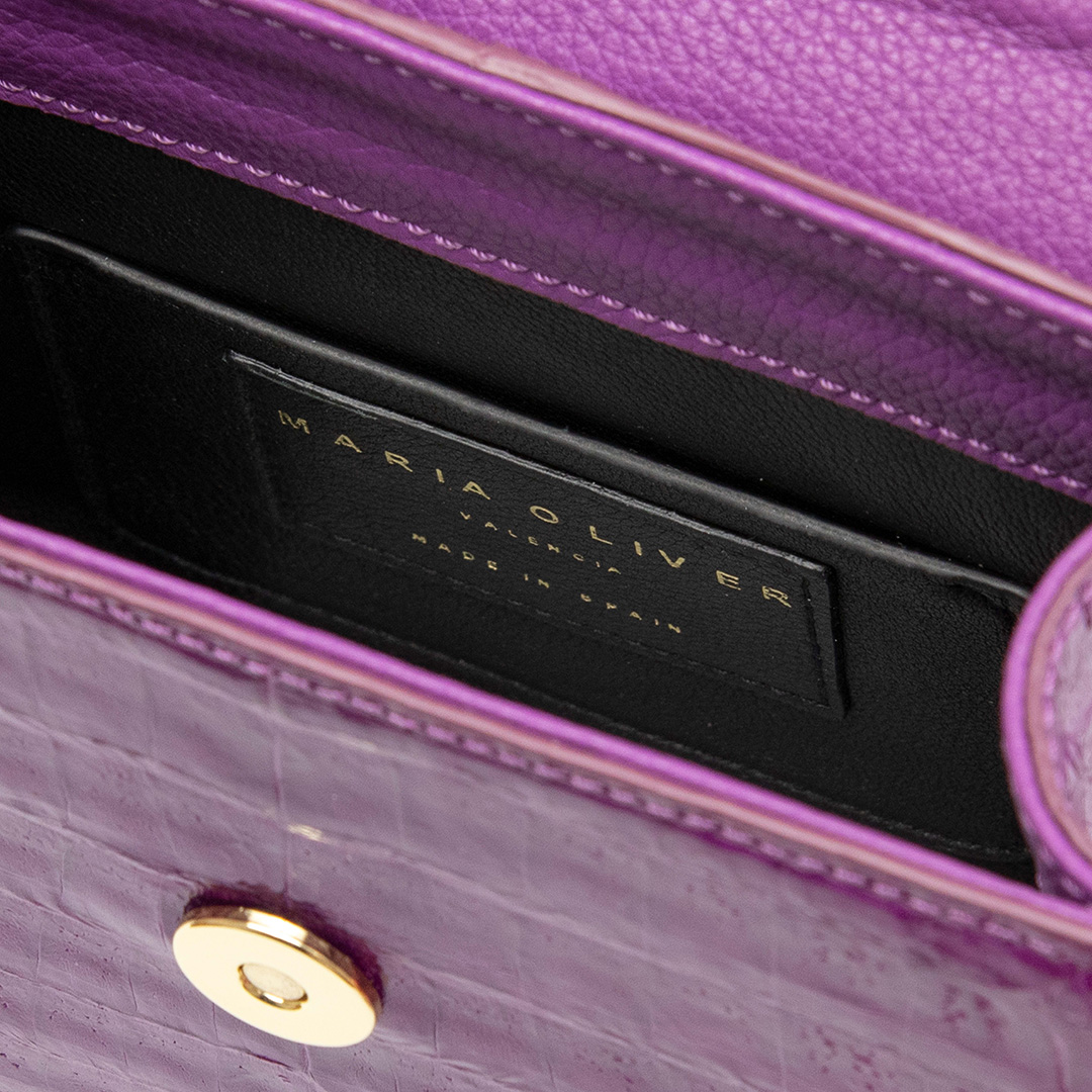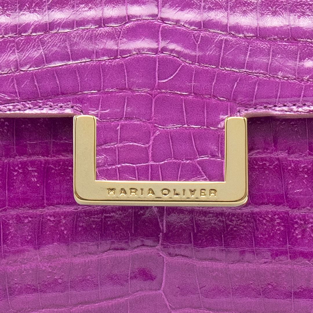 MINI MICHELLE is a brand icon: Crocodile leather, VIOLET, glazed, gold finish. Mini bag model. This versatile style works beautifully from day to night. Whether wearing this style as a top handle or crossbody, the MINI MICHELLE is the ultimate accessory to have in your wardrobe.