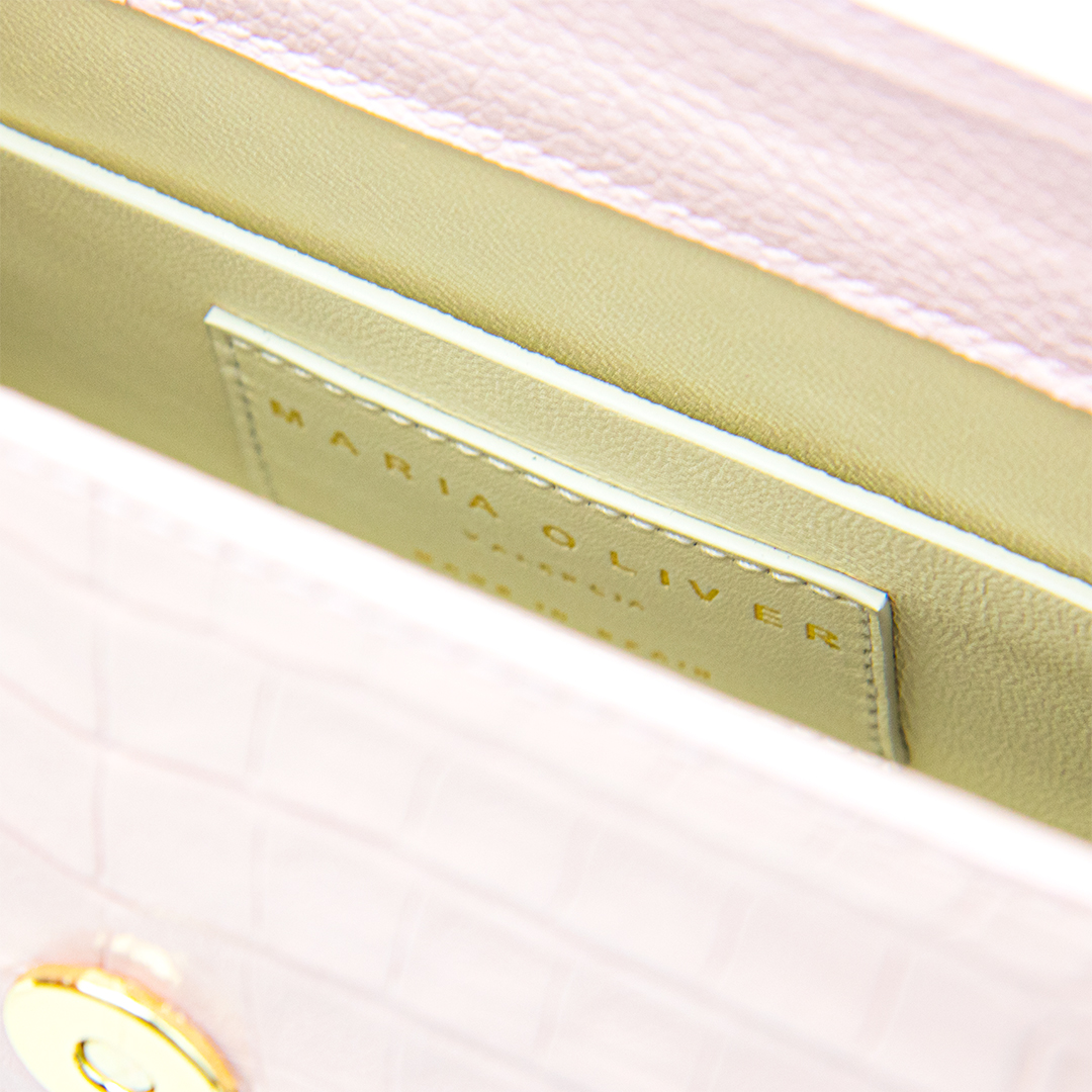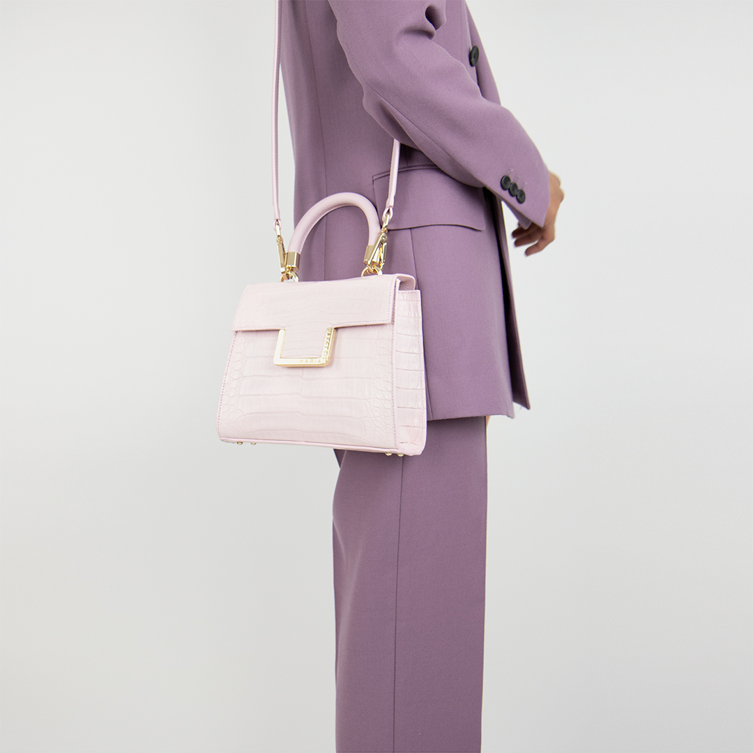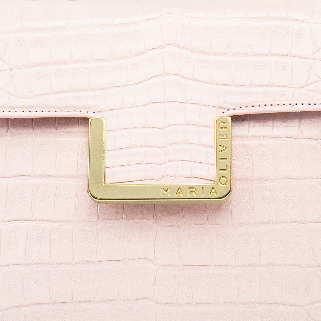 SMALL MICHELLE is the perfect size for both day and night activities. PINK ROSÉ crocodile with glazed, gold finish. Purse. Includes a luxurious leather strap to take this style from a tophandle to a crossbody.