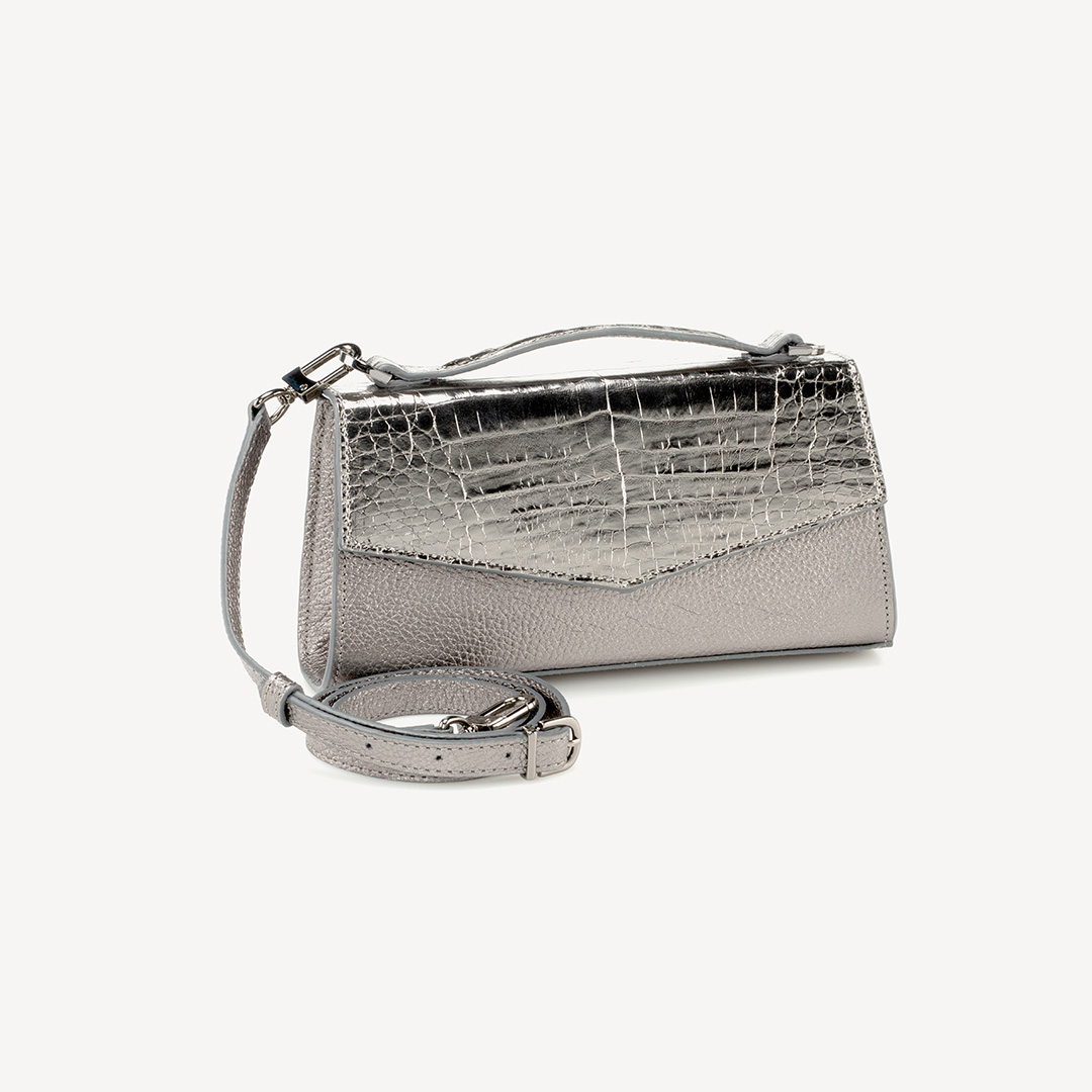This versatile shape is the perfect companion to take you from day to night: Crocodile leather and cow, ANTHRACITE GREY, metal, gun metal finish. Use as an elegant top handle or as a crossbody for a more casual look. Also fits perfectly on the hand as a clutch for all occasions. Accommodates all of your essentials including a mobile phone.