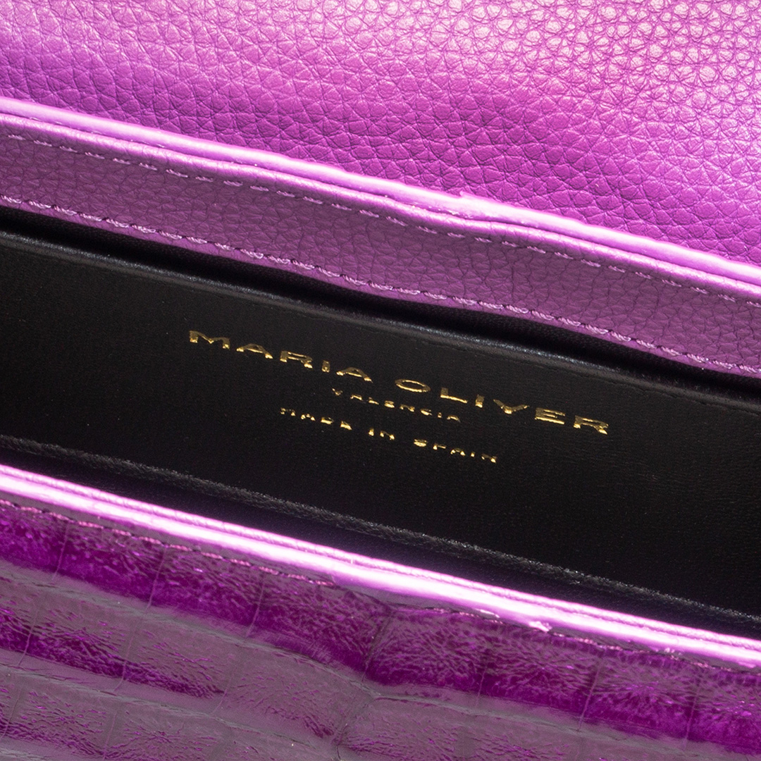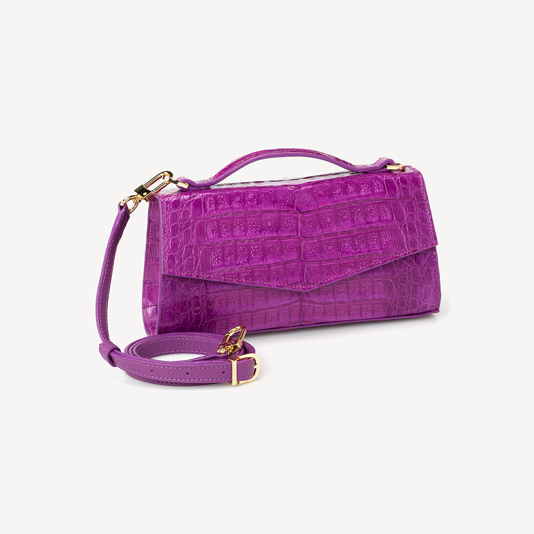This versatile shape is the perfect companion to take you from day to night: Crocodile leather, VIOLA VIOLET, glazed, gold finish. Use as an elegant top handle or as a crossbody for a more casual look. Also fits perfectly on the hand as a clutch for all occasions. Accommodates all of your essentials including a mobile phone.