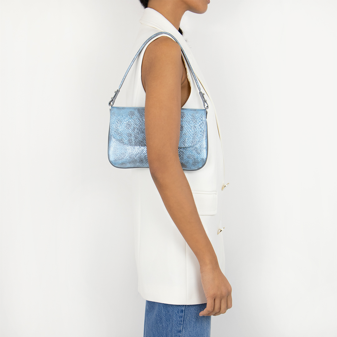 Luisa is an elegant baguette bag: Karung leather, BLUE, glittered, silver finish. Flap bag model. The perfect everyday silhouette. This sleek and modern style features a strap that can be worn on the shoulder or as a wristlet. You can also remove the strap and wear the Luisa as a clutch. Luisa is the perfect option for fashionistas. It is playful yet feminine and has an understated elegance that complements a broad range of looks.