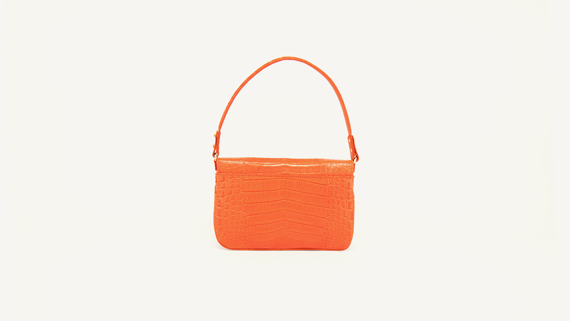 Luisa is an elegant baguette bag: Crocodile leather, ORANGE, glazed, gold finish. Flap bag model. The perfect everyday silhouette. This sleek and modern style features a strap that can be worn on the shoulder or as a wristlet. You can also remove the strap and wear the Luisa as a clutch. Luisa is the perfect option for fashionistas. It is playful yet feminine and has an understated elegance that complements a broad range of looks.