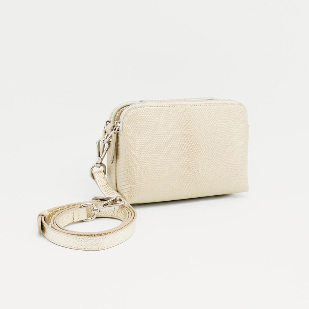 Lucia is a cross body bag, a must-have that everyone should own: Lizard leather, ARGENTO, metal, silver finish. Double zipper bag model. A classic camera silhouette with delicate rounded lines. A functional design that includes two outside zipper compartments to keep your personal items secure. The Lucia is the perfect “on the go” style. It can be worn on the shoulder or across the body. The Lucia’s elegant chain with leather shoulder guard give this a contemporary and elegant look.