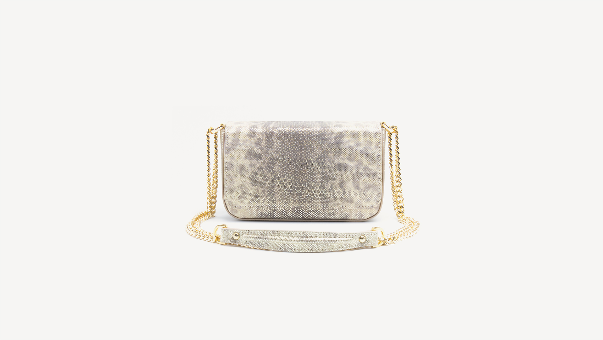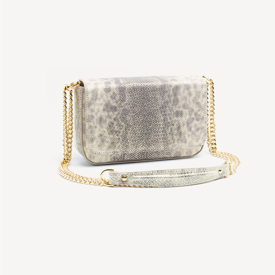 Violeta is the perfect style for day to evening dressing. Karung leather, NATURAL, glittered, with gold finish. Adjustable crossbody model. The Violeta adds versatility to your wardrobe. Wear as a crossbody for a great hands-free option. Adjust the luxurious chain and wear on your shoulder for a night out. This compact style fits all your essentials including a mobile phone. The flap closure keeps all your items safe and secure.