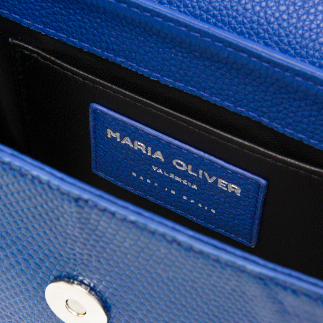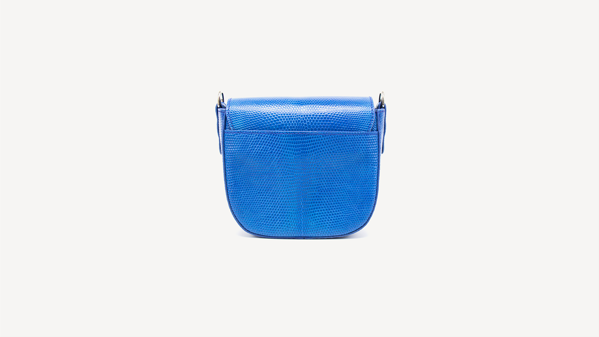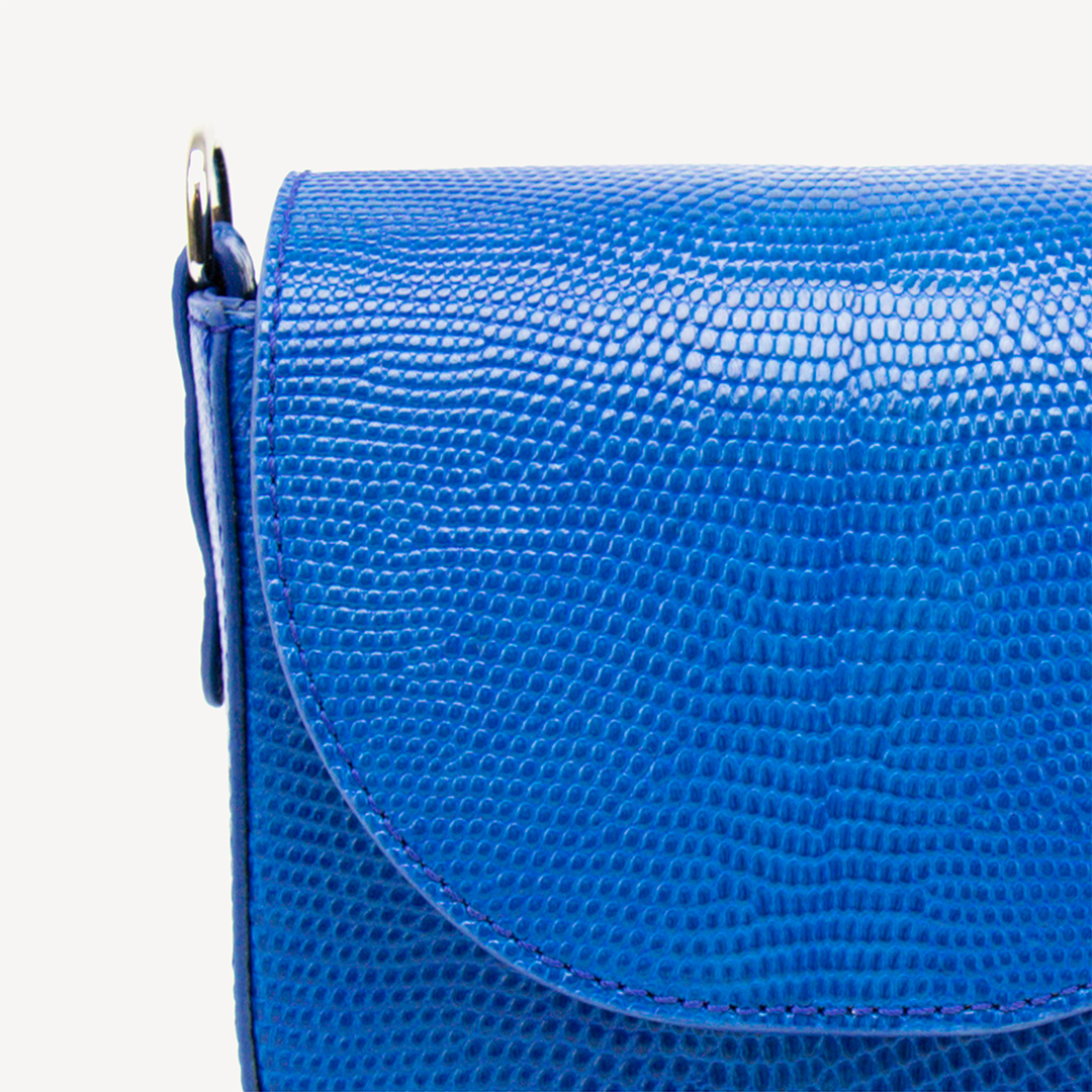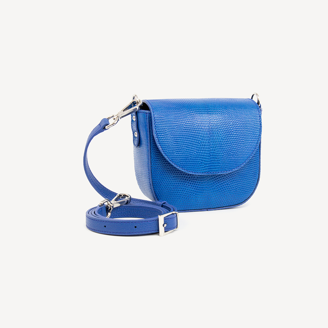 Diana is a new design of a saddle bag: Lizard leather, BLUE, glazed, silver finish. Cross body bag model. Our modern interpretation of a saddle bag. Hold all of your daily essentials in our sweet Diana crossbody. The refined shape and understated elegance makes this silhouette your perfect companion for all occasions. You can carry Diana as a shoulder bag or wear it more casually across the body. The sleek metallic chain with a luxurious leather shoulder guard add to the functionality of this versatile style.
