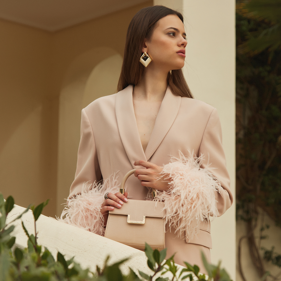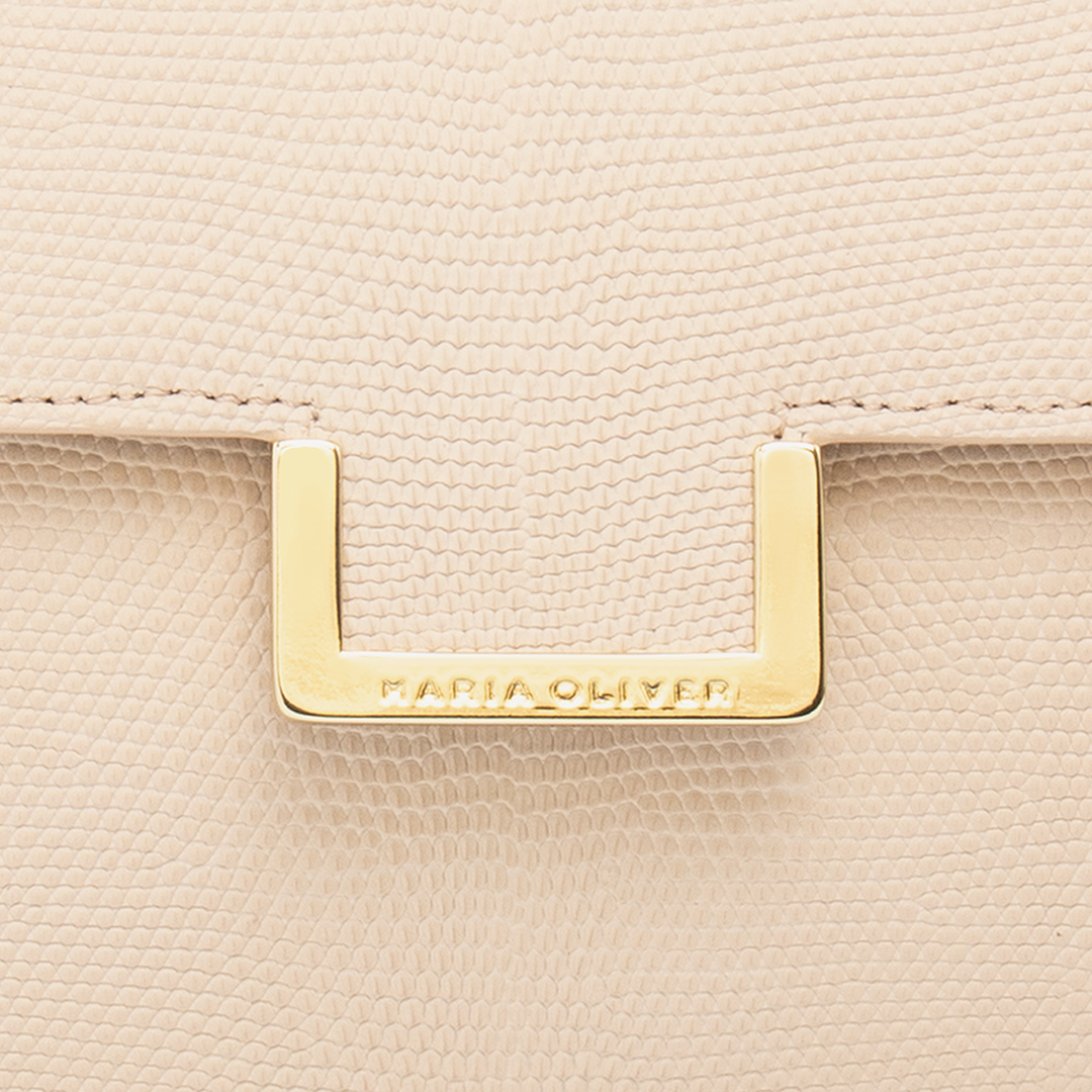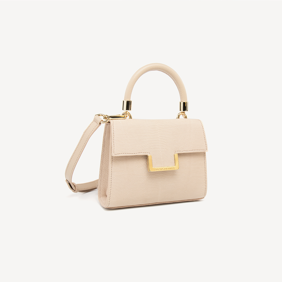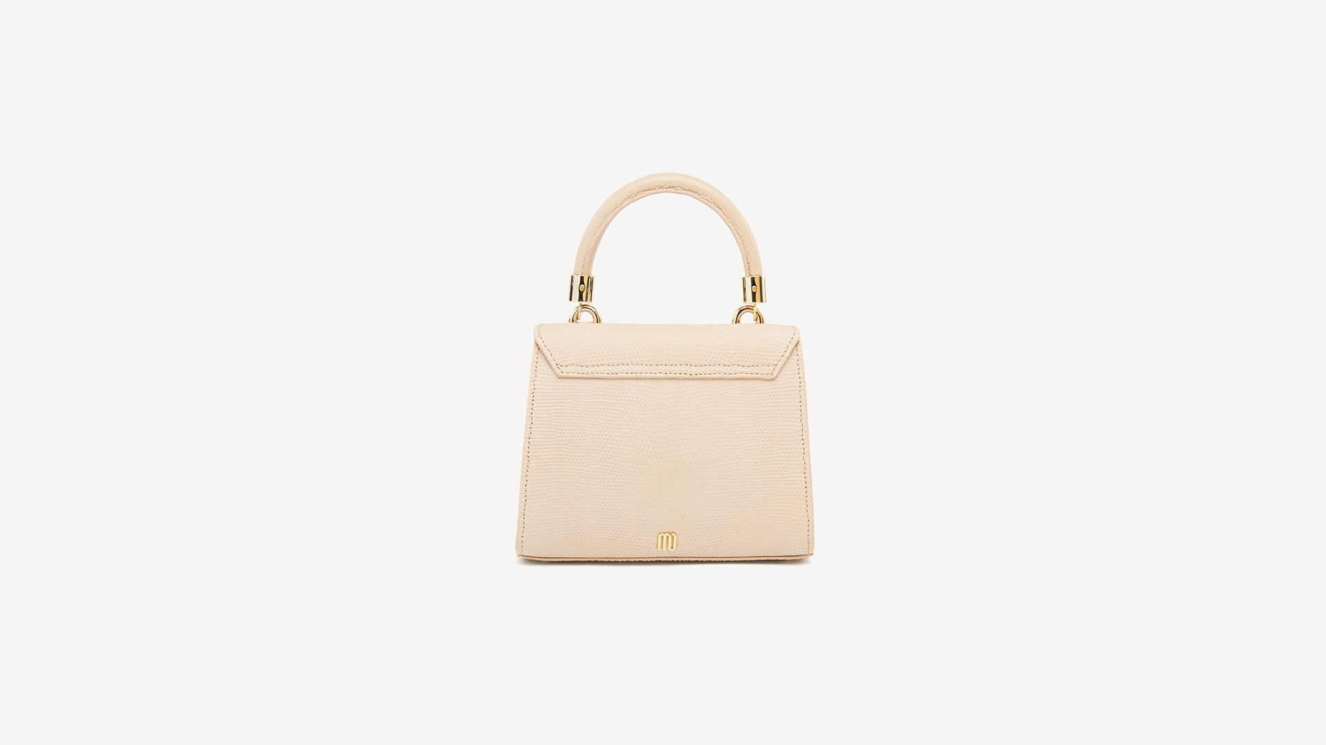 MINI MICHELLE is a brand icon: Lizard leather, NEW BEIGE, matte, gold finish. Mini bag model. This versatile style works beautifully from day to night. Whether wearing this style as a top handle or crossbody, the MINI MICHELLE is the ultimate accessory to have in your wardrobe.