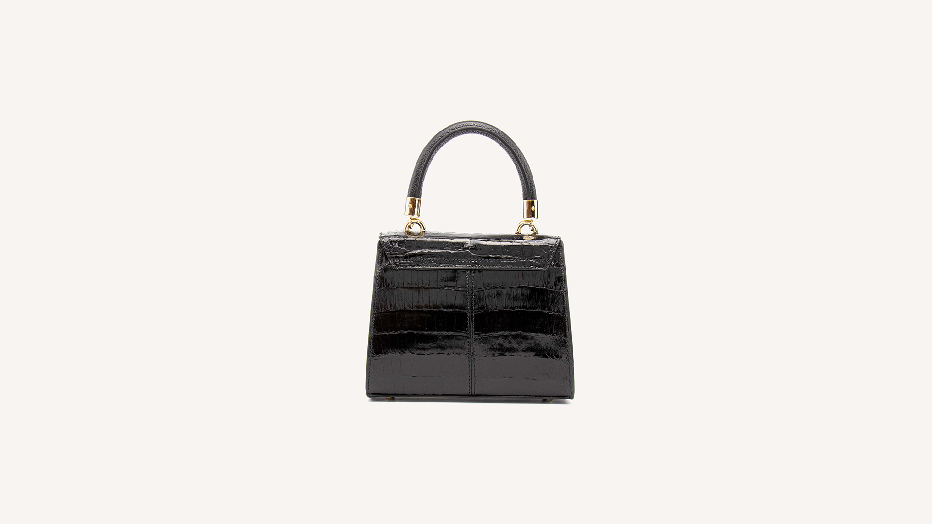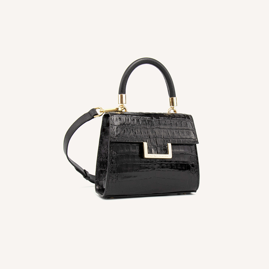 MINI MICHELLE is a brand icon: Crocodile leather, BLACK, glazed, gold finish. Mini bag model. This versatile style works beautifully from day to night. Whether wearing this style as a top handle or crossbody, the MINI MICHELLE is the ultimate accessory to have in your wardrobe.
