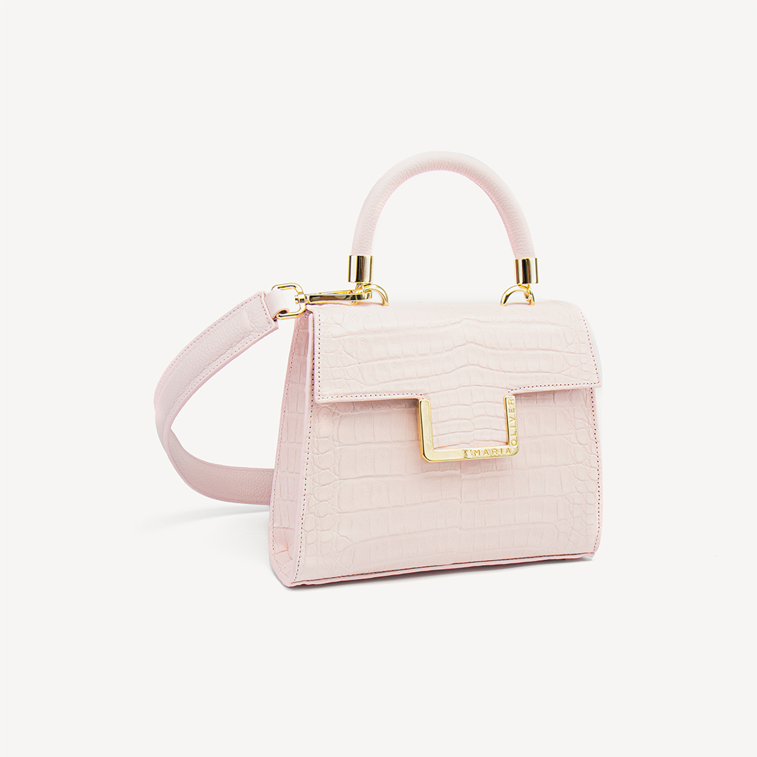 SMALL MICHELLE is the perfect size for both day and night activities. PINK ROSÉ crocodile with glazed, gold finish. Purse. Includes a luxurious leather strap to take this style from a tophandle to a crossbody.