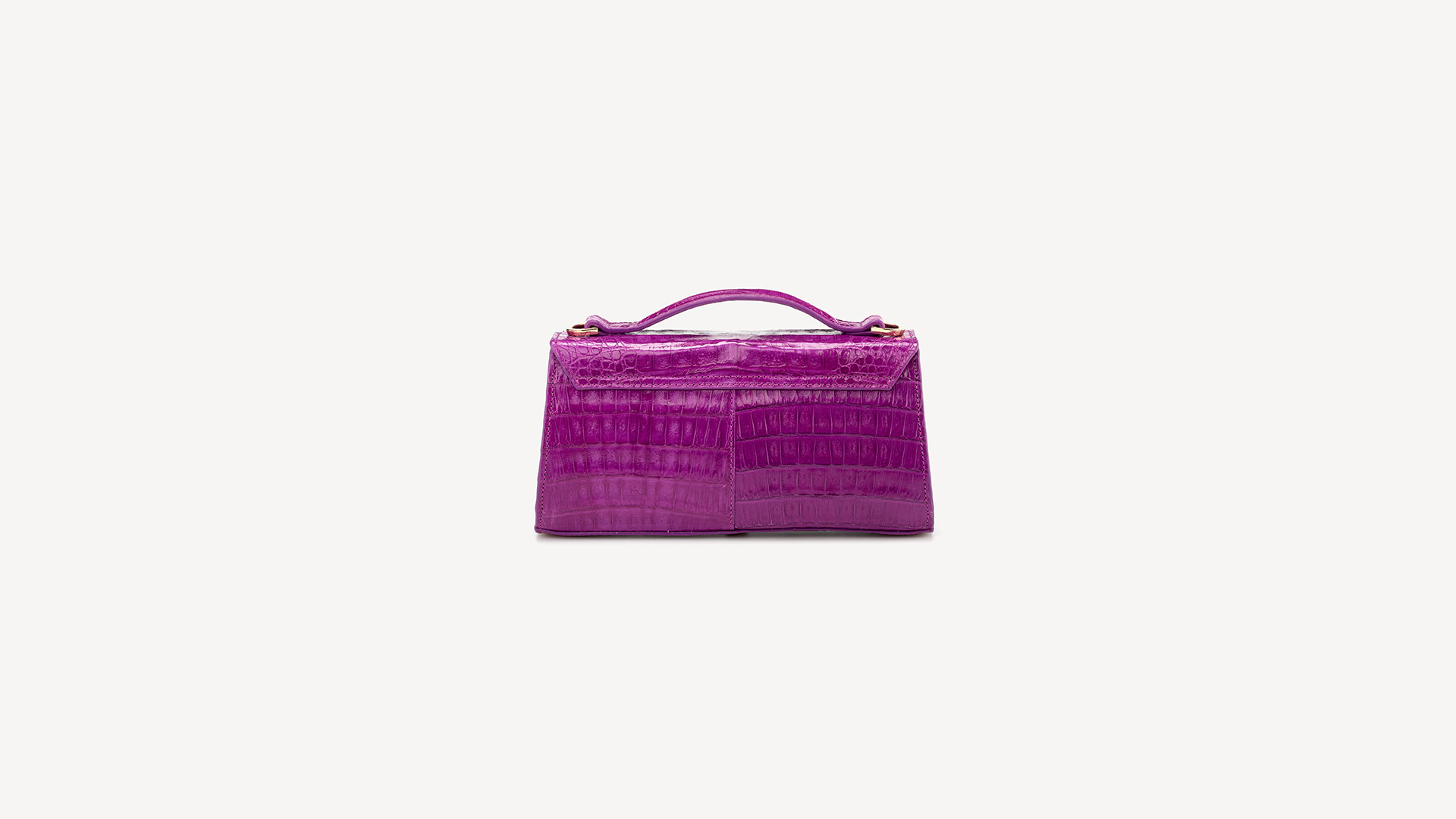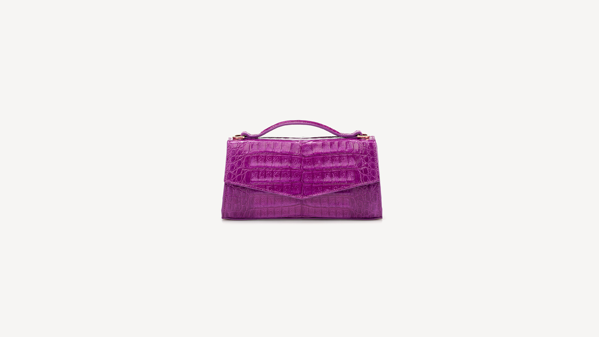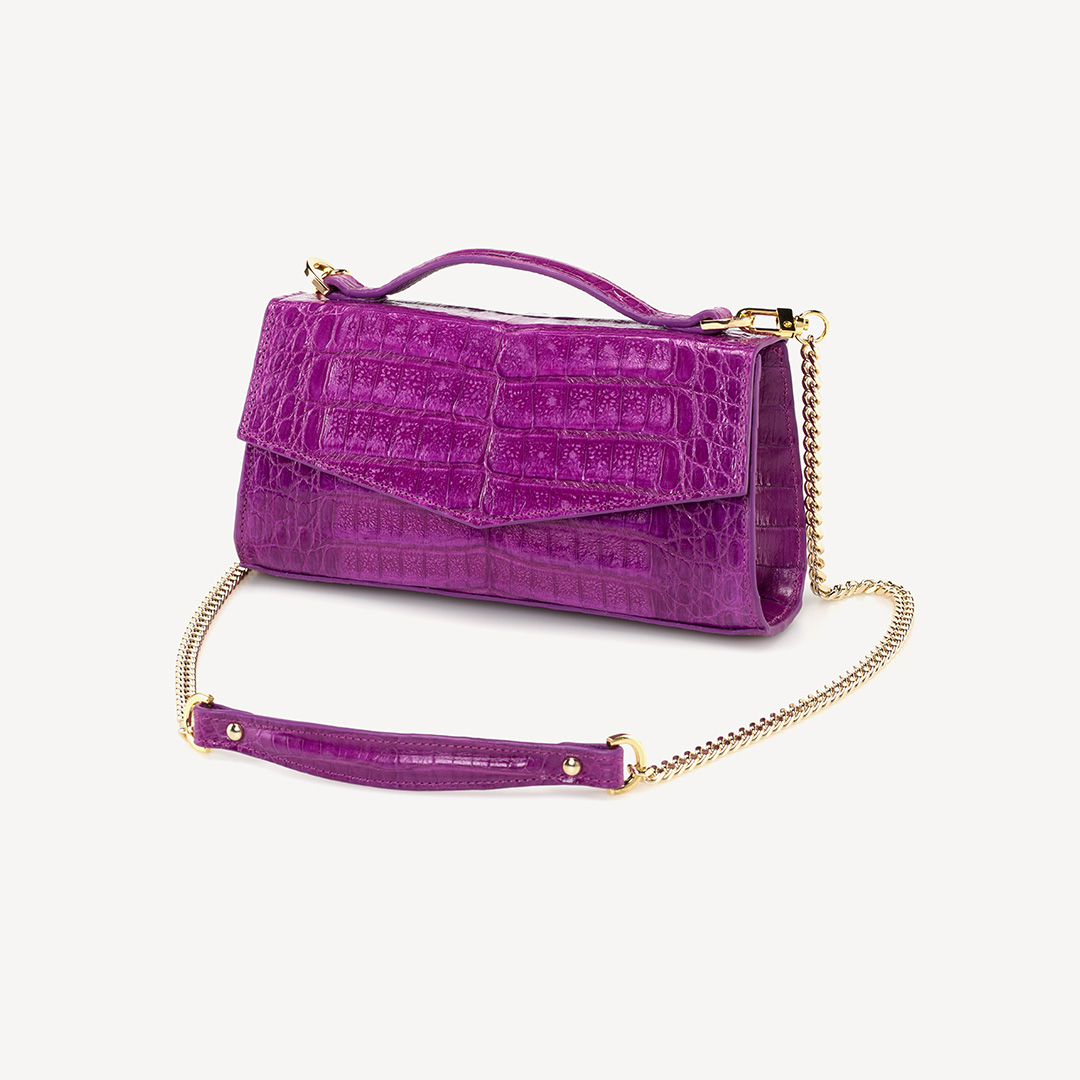 This versatile shape is the perfect companion to take you from day to night: Crocodile leather, VIOLA VIOLET, glazed, gold finish. Use as an elegant top handle or as a crossbody for a more casual look. Also fits perfectly on the hand as a clutch for all occasions. Accommodates all of your essentials including a mobile phone.