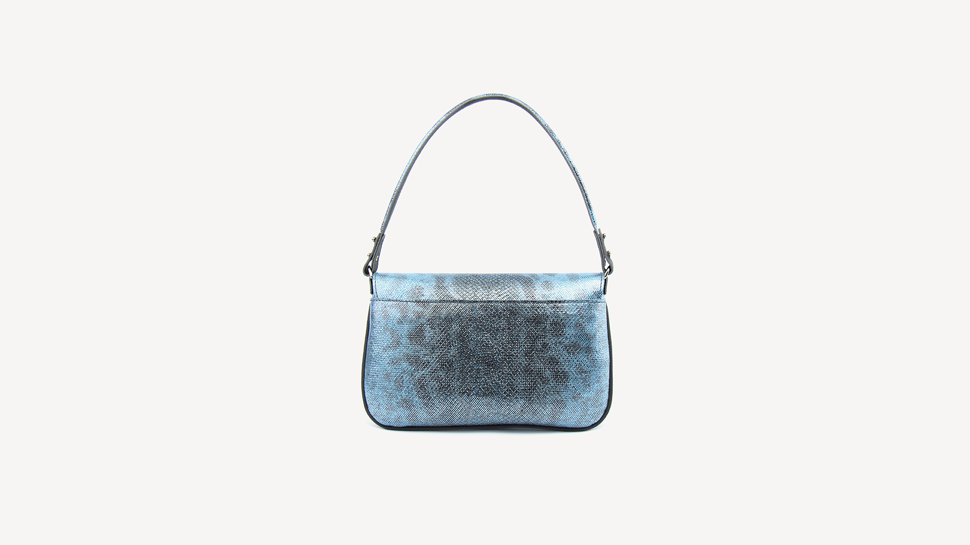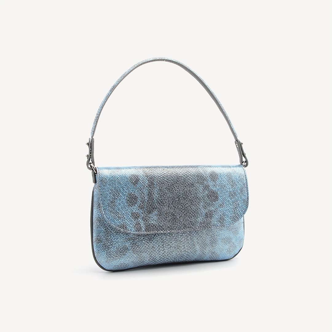 Luisa is an elegant baguette bag: Karung leather, BLUE, glittered, silver finish. Flap bag model. The perfect everyday silhouette. This sleek and modern style features a strap that can be worn on the shoulder or as a wristlet. You can also remove the strap and wear the Luisa as a clutch. Luisa is the perfect option for fashionistas. It is playful yet feminine and has an understated elegance that complements a broad range of looks.