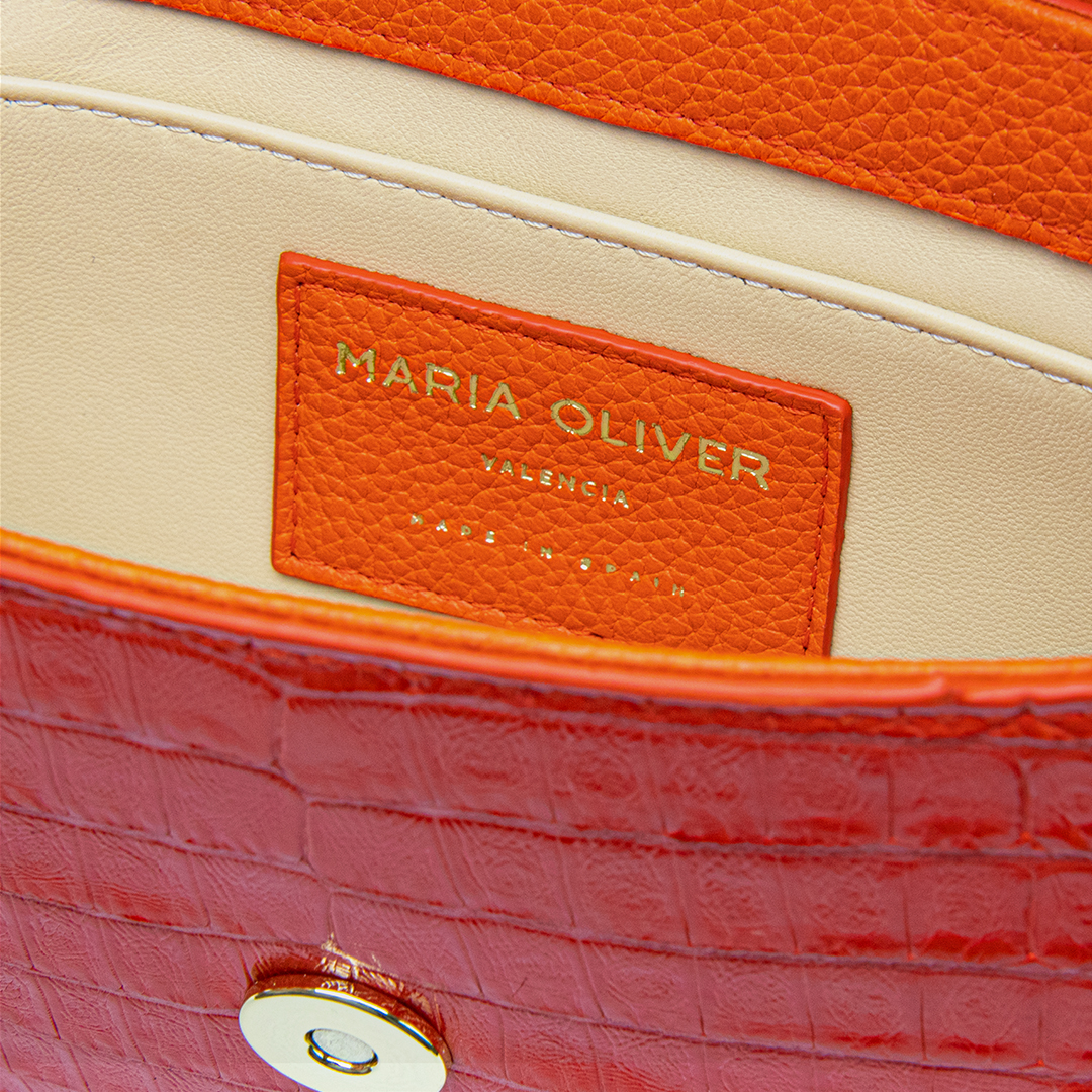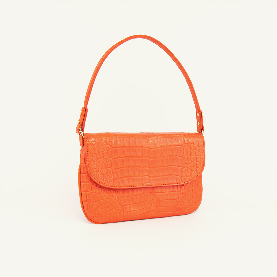Luisa is an elegant baguette bag: Crocodile leather, ORANGE, glazed, gold finish. Flap bag model. The perfect everyday silhouette. This sleek and modern style features a strap that can be worn on the shoulder or as a wristlet. You can also remove the strap and wear the Luisa as a clutch. Luisa is the perfect option for fashionistas. It is playful yet feminine and has an understated elegance that complements a broad range of looks.